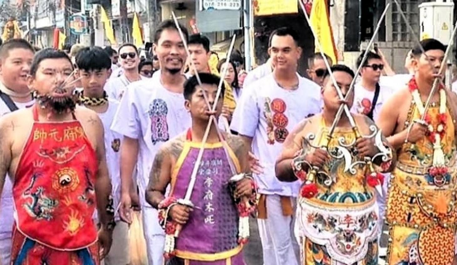 Это значимое шествие, символизирующее путешествие божества Киу Онг Тай Те, призванного даровать счастье и процветание местному населению, собрало медиумов-духов, преданных последователей и жителей острова. Процессия стартовала от храма, пройдя по улицам города Пхукет, достигла мыса Сапхан Хин, а затем вернулась к святилищу. Этот обратный путь, сопровождаемый ароматным дымом благовоний и мерцанием свечей, символизирует возвращение божественных благословений в общину. Шествие открыли группы знаменосцев, несущих флаги и транспаранты, за которыми следовали малые паланкины, или «Цай Би», и величественный главный паланкин, или «Тао Лиан», в котором бережно перевозили изображение божества.