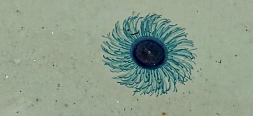 Синие медузы-кнопки, также известные как порпиты, представляют собой колониальные гидроидные полипы, которые часто ошибочно принимают за настоящих медуз. Их легко узнать по яркому синему окрасу и характерному круглому, кнопкообразному диску в центре тела, диаметр которого обычно составляет 2–3 сантиметра. Вокруг диска расположено множество тонких щупалец. Эти организмы дрейфуют с океанскими течениями и нередко выбрасываются на берег волнами, где они могут сохранять свою опасность даже в высохшем состоянии.