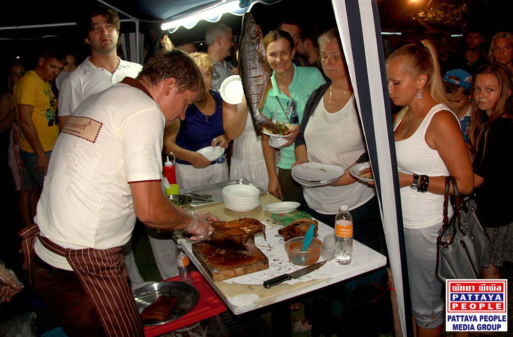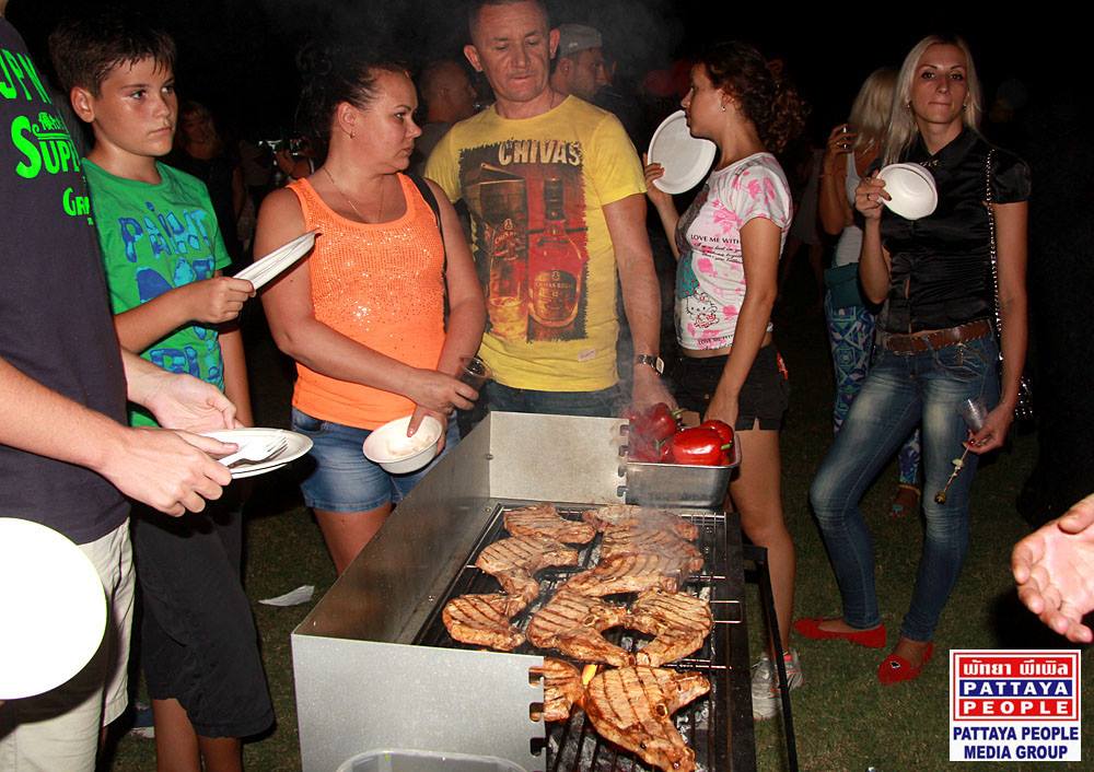 Ну, и конечно, как говорится, не хлебом единым, а в данном случае не мясом единым сыт человек… мероприятие сопровождалось разнообразной развлекательной программой. На протяжении всего вечера один номер сменялся другим. Вниманию зрителей были представлены танцы, песни, зумба тренировка и даже акробатические трюки в исполнении маленьких гимнастов. Особенно запомнились малыши, показавшие умилительный танец в народных костюмах. Чтобы расшевелить разомлевшую на жаре публику, на сцене зажигали Barry Upton (Бари Аптон), радиоведущий Pattaya People 96FM, и его команда с популярными хитами в стиле рок-н-ролл, а за диджейским пультом играла Ола.