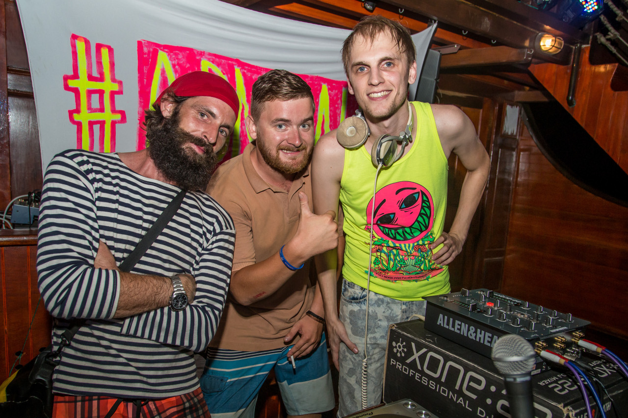 Встречал гостей Бородатый пират, мягко сказано, уже пригубивший пару-тройку, а то и больше, рюмок рома. Настоящие барабаны тех времён, установленные на палубе корабля, придали вечеринке дух пиратского веселья. Гостей развлекали такие ди-джеи, как OLEG OJO, Roman Astanin, Nut, Simple J, Jamie Page, Dennis Frost.